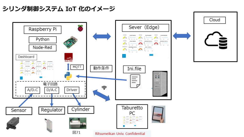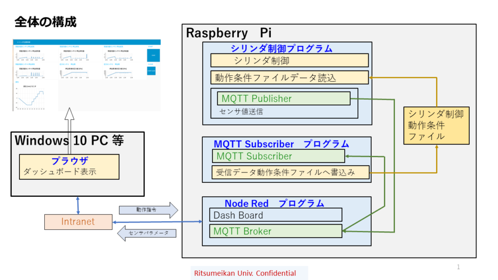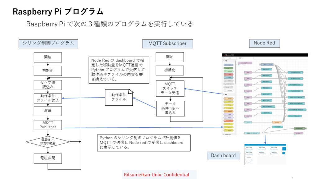 このシステムは、シリンダ制御のコントローラとしてRaspberry Pi を使用し Python 言語により構築した。また、装置の操作や表示を容易に GUI 環境で構築できるように Node Red をRaspberry Piに組み込んだ。 また、Node Red とシリンダ制御プログラム間のデーター通信としてMQTT を使用した。Node Redの画面ははネットワーク上の他のPC等でもプラウザを使用してアクセス可能である。