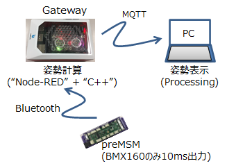 ハードの構成を図1に示す。ハードとしては、9軸センサBMX160を搭載したpreMSM、センサ出力を受信しオイラー角の計算を行うGatewayとオイラー角を元に姿勢表示を行うPCの3つで構成される。