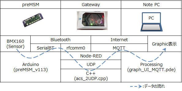 1. preMSM上のArduinoの環境で動作するBMX160のライブラリから出力されたデータは、BluetoothでGatewayに送られる。