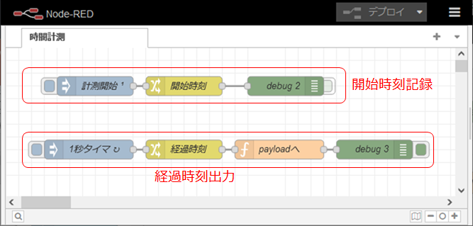 フローは、2つのブロックに分かれます。(1) 開始時刻記録と (2) 経過時刻出力です。それぞれ、中身を見ていきます。