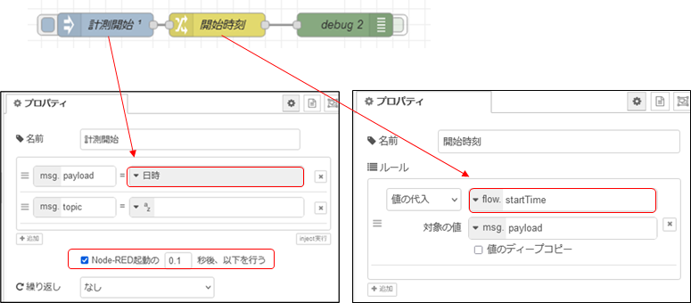 「計測開始」のinjectionノードは、デプロイ直後に1回だけ、msg.payloadに日時を載せて送り出します。