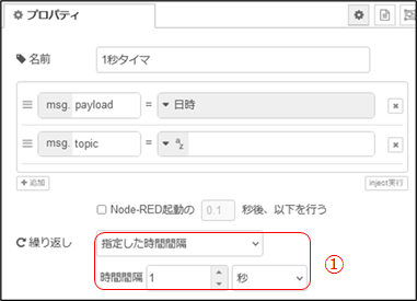 このノードでは、繰り返し機能を使って、1秒毎に現在の日時をmsg.payloadに載せて出力します。