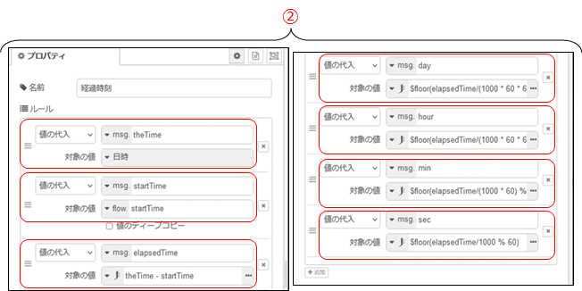 このノードでは、現在の日時をmsg.theTimeに入れます。そして、「開始時刻」flow.startTimeを、msg.startTimeに呼び出して引き算し、経過時間を得ます。