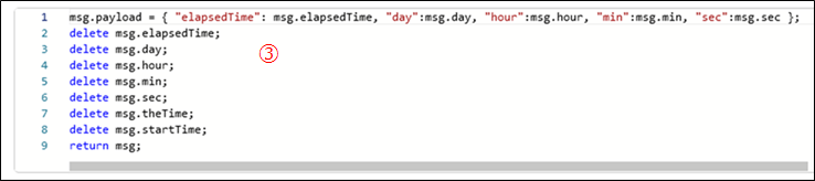 msg.payload = { “elapsedTime“: msg.elapsedTime, “day“:msg.day, “hour“:msg.hour, “min“:msg.min, “sec“:msg.sec };