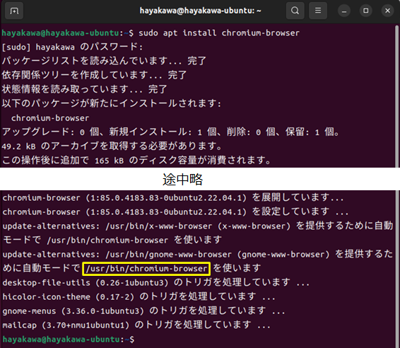 以下に、端末画面の表示を載せます。最後の方に、chromium-browserがインストールされているパスが載っています。