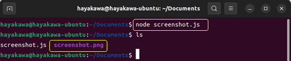 page.screenshot({path: ‘screenshot.png’});の部分が、スクリーンショットの保存ファイル名になります。現状の記述は、実行フォルダにscreenshot.pngというファイル名で保存されます。こちらも必要に応じて変更してください。