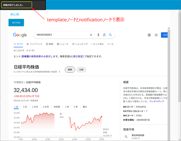 injectノードもしくはbuttonノードが押されると、execノードで、”node screenshot.js”を実行します。その結果、出来たscreenshot.pngファイルをread fileノードで読込み、base64ノードで変換して、templateノードでダッシュボードに表示します。その下のtemplateノードとnotificationノードは、ダッシュボード画面に「更新が完了しました」というメッセージを表示させるためのものです.