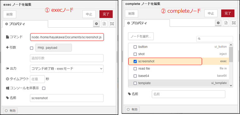 ②のcompleteノードは、プロパティでチェックを入れたノードのメッセージ処理完了を受けてフローを開始します。ここでは、screenshotの名称のexecノードを対象にしています。 すなわち、execノードの処理が完了したらフローが開始されます。