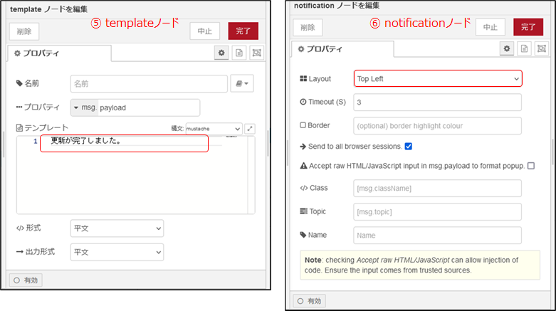 ⑤のtemplateノードは、次段のnotificationノードに表示させる文字列を記載します。