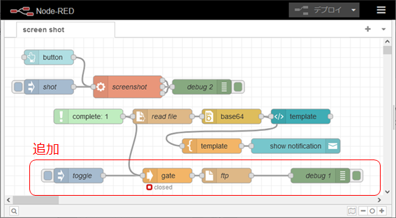 toggle名のinjectノードを押して、gateをopenした後、puppeteerを実行することで、取得したscreenshot.pngをftpで送信します。