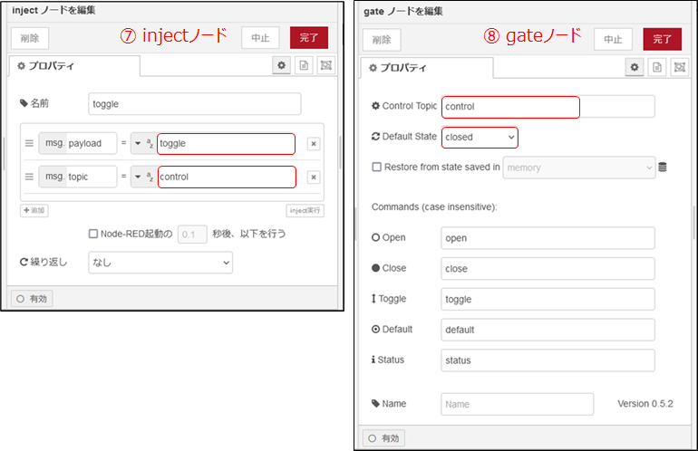 ⑦のinjectノードは、topicをgateノードの“Control Topic”に合わせて、controlにします。payloadは、ここでは“toggle”にします。