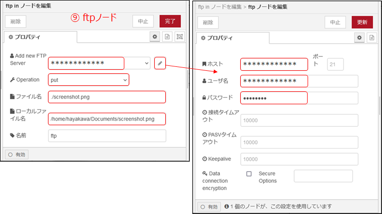 ⑨のftpノードは、FTP Serverを設定します。鉛筆マークをクリックすると、Serverの設定画面が現れますので、ホスト、ユーザー名、パスワードを入力して下さい。