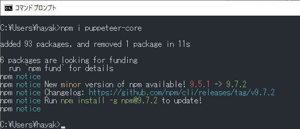 端末画面を開いて以下のコマンドを入力して、puppeteer-coreをインストールします。