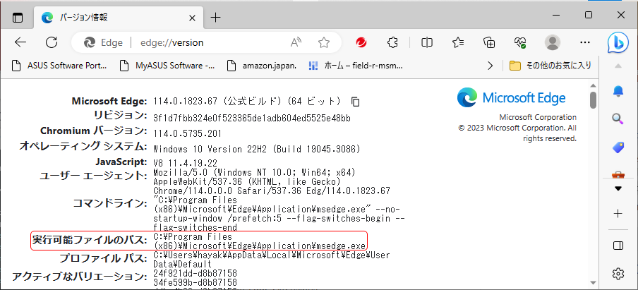 パスを確認するには、Edgeを起動します。urlを入れる欄に、”edge://verion“と入力してリターンします。