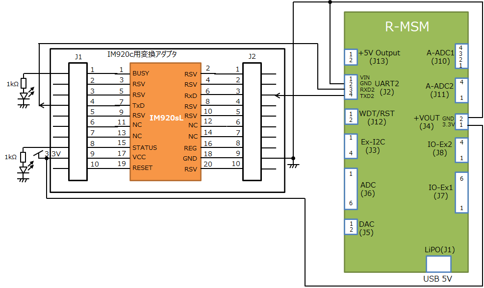 接続回路図を次に示します。R-MSMのUART2ソケットと+VOUTソケットとIM920sLの各端子を接続します。IM920sLの動作モニタのため、BUSY信号とSTATUS信号には、LEDを付けています。