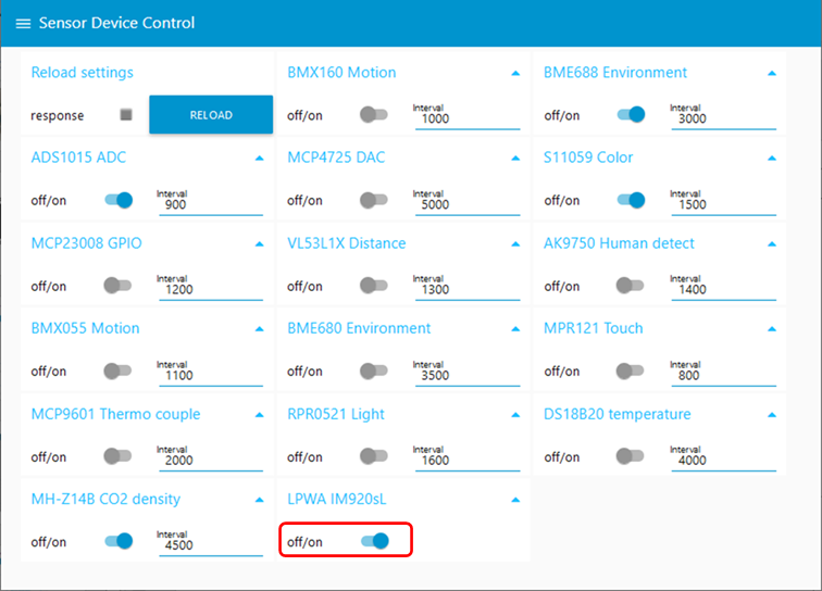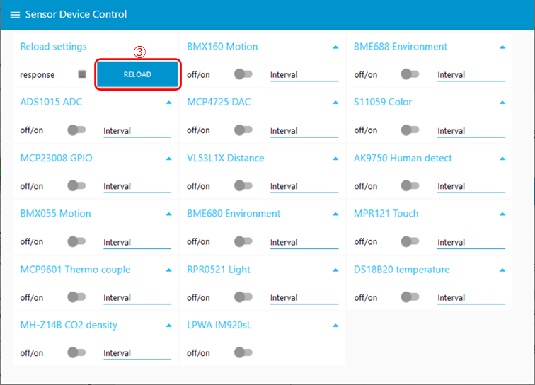 ③ センサ選択画面が出てきます。現状の設定を知るために「RELOAD」ボタンを押します。
