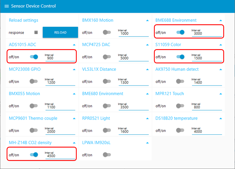 ・現状、動作が許可されているBME688,ADS1015,S11059,MH-Z14BのチェックボタンがONになります。