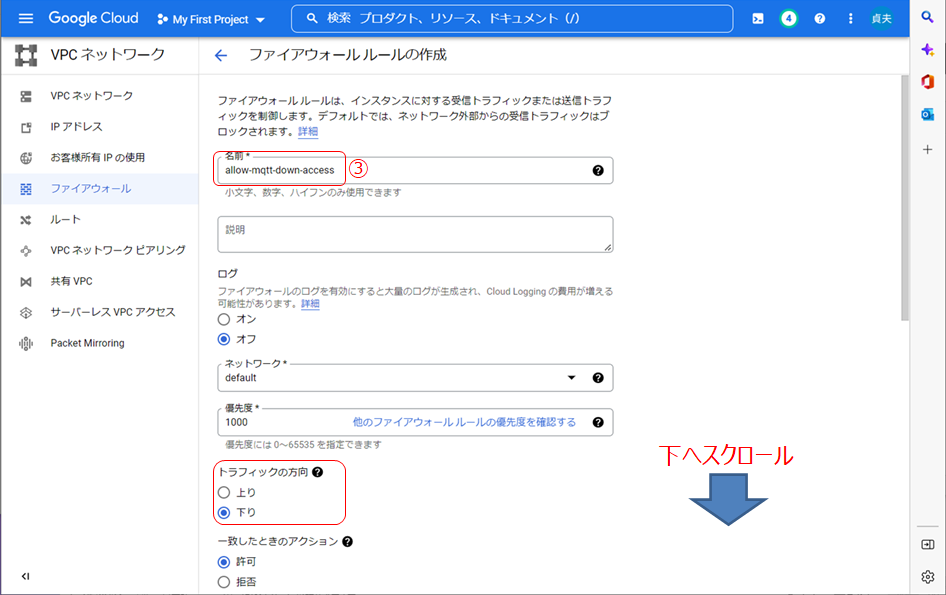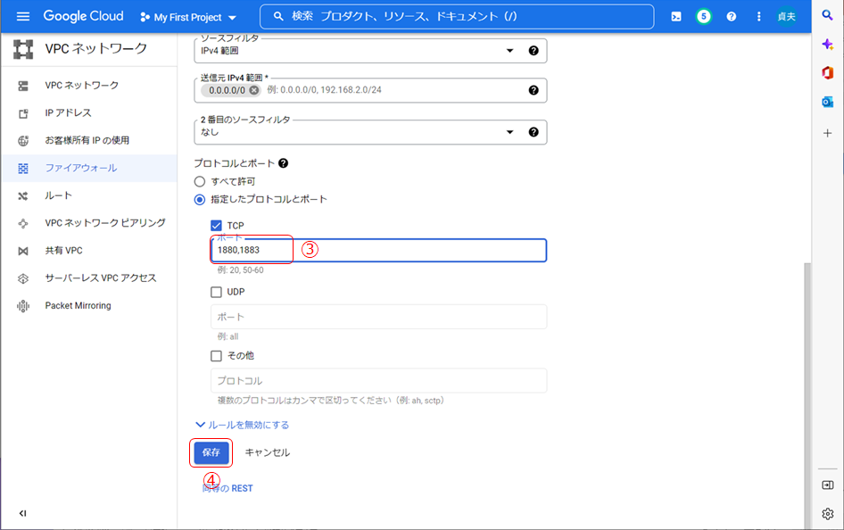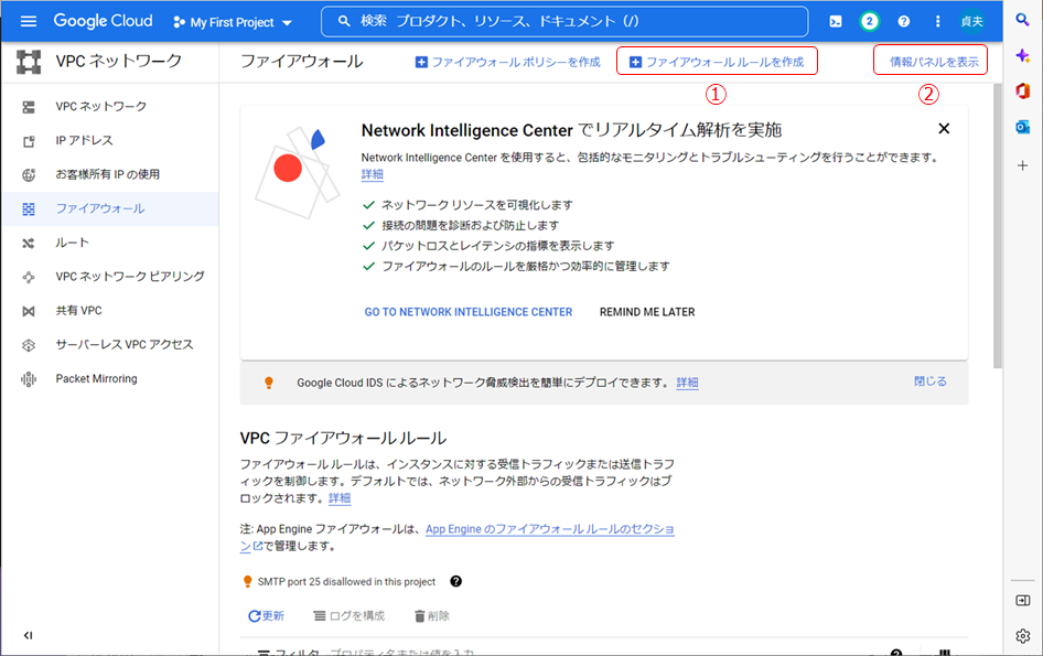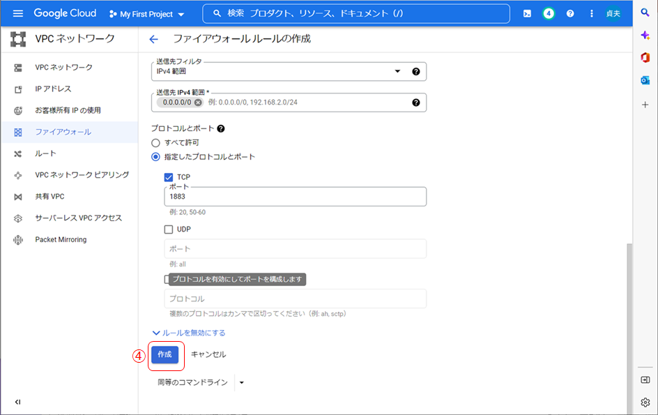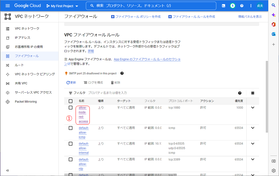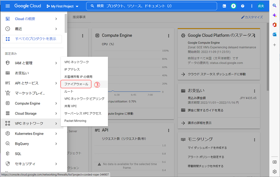 ③ 左上の「ナビゲーションメニュー」から「VPCネットワーク」→「ファイアウォール」を選択します。