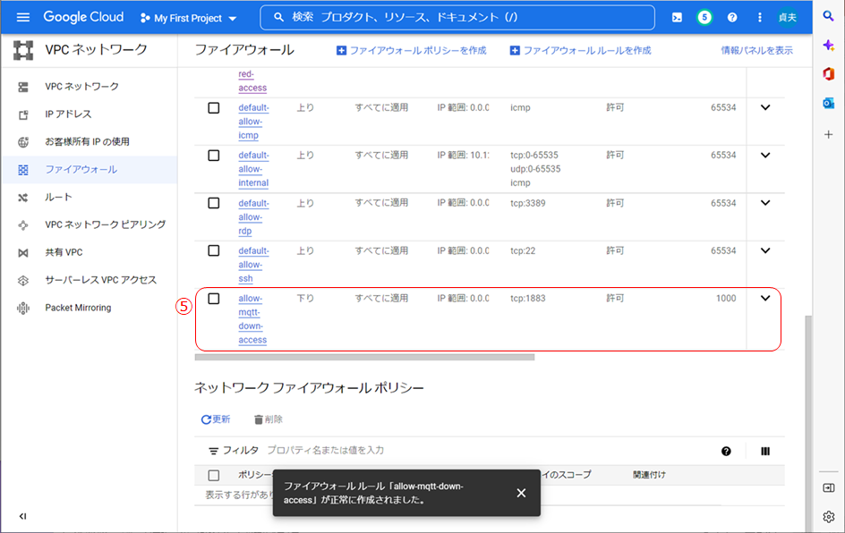 ⑤ ファイアウォールの画面に戻りますので、ルールが出来ているか確認します。