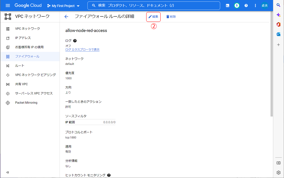 ② ルールの詳細画面に移動しますので、「編集」ボタンを押します。