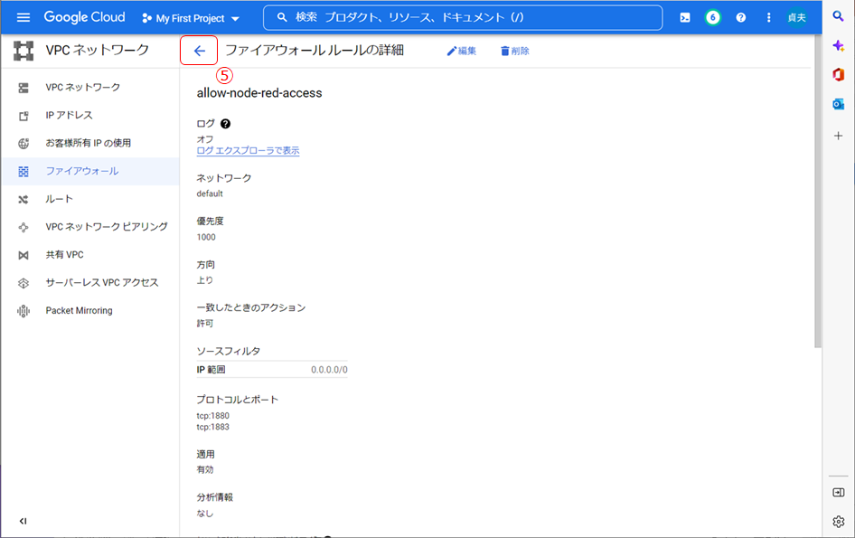⑤ ルールの詳細画面に戻りますので、矢印を押して、ファイアウォールの画面に戻ります。