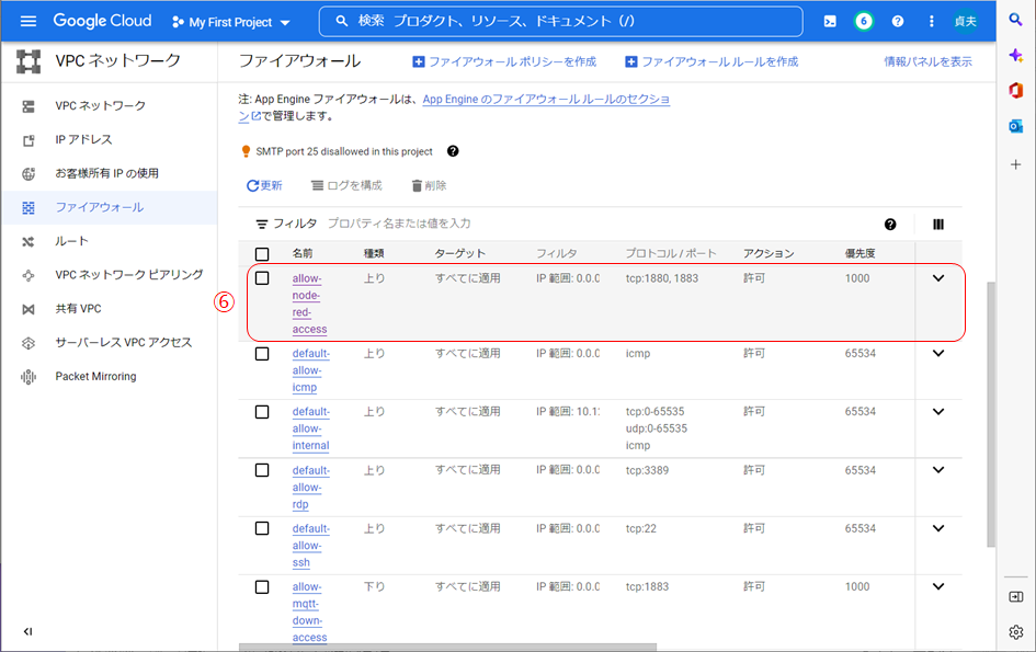 ⑥ ファイアウォールの画面に戻りますので、ルールを修正出来ているか確認します。