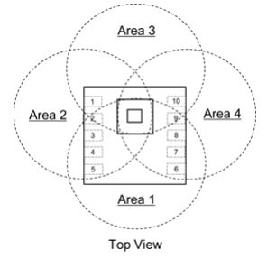 それぞれのIRセンサー素子の観測可能領域は、下図に示す内容となっています。出力されるデータは相対的なもので絶対的な精度はありません。被測定物の温度やセンサ自身の温度、センサのばらつきによってかなり変化します。詳細につきましては AK9750 データシートをご覧ください。