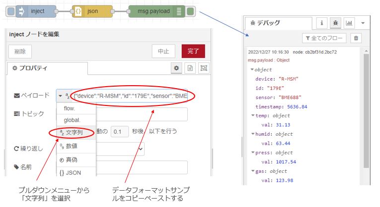 *テストやデバッグの際には下記のデータフォーマットサンプルをコピーし、Node-REDのinjectノードに文字列として設定することでセンサモジュールのシミュレータとして利用できます。