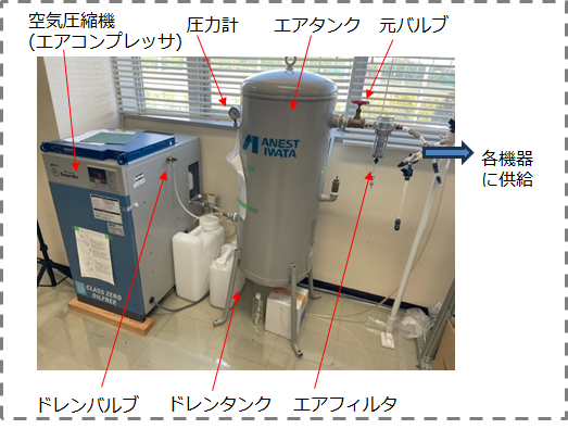 空気圧縮機は、以下の図のような形状をしています。圧縮機で圧縮した空気はエアタンクに蓄えられ、エアフィルタを経由して各機器に供給されます。空気圧縮機は、圧力値の設定ができます。圧力値が設定値を上回っていると空気圧縮機は止まって待機しています(①待機状態)。そして、ときどき内部の換気のためにファンを回します(②換気状態)。空地が使用され、圧力が設定値を下回ると空気圧縮機が動作を開始し空気の圧縮が行われます(③圧縮状態)。空気圧縮機には、内部にたまる水を抜くためにドレンバルブが付いています。このドレンバルブを開けると内部の水を含んだ空気がドレンタンクに排気されます(④排気状態)。そのうち圧力が設定値を下回ると空気圧縮機が動作を開始します(⑤排気+圧縮状態)。