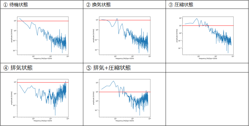 以下の図の赤い横線は101の目盛りにひいています。①待機状態から、②換気状態で100Hz~200Hzのレベルが盛り上がっています。④排気状態は、1kHz以上のレベルが高くなり101レベルまで上がっています。③圧縮状態では全体にレベルがあがりピークは102を超えています。⑤排気+圧縮状態では、⑤圧縮状態に1kHz以上のレベルを101レベルまで上げた形状になっています。この5つの状態を分類します。
