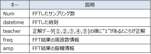 {"Num":1024,"datatime":"2023-12-07_08_52_54","teacher":[1,0,0,0,0],"freq":[15.625,31.25, ・・・,7968.75, 7984.375], “amp”:[13.754181045486426,10.118336580982199,・・・, 0.04267337029706663,0.030070514350138387]}]
