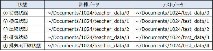 したがって、画像データを見て5つの状態のどれかを人間が判断して、それに対応する数値データにキー“teacher”:[1,0,0,0,0],)を追加し、訓練データとテストデータをそれぞれ一つにまとめればOKです。
