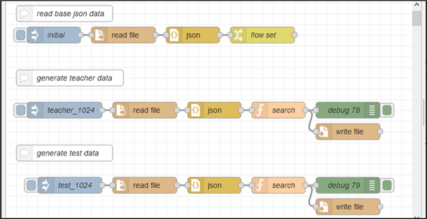 上記で作成した画像データの訓練データとテストデータの1024.jsonと数値データのall_data.jsonをマッチングして訓練データとテストデータを作成します。フローを以下に示します(フローのjsonファイルはAppendix.1に掲載しています)。一番上の列が、all_data.jsonを読み込み、“flow.data”に読み込む動作をします。一番初めに実行します(injectボタンを押す) 。