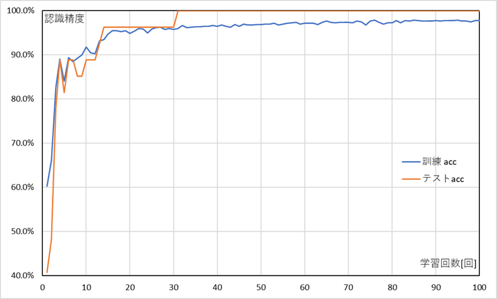 青の線が、訓練データの認識精度でオレンジがテストデータの認識精度です。訓練データの認識精度は徐々に上がっていき97%程度まで上がりました。テストデータは30回過ぎで100%分類できるようになりました。