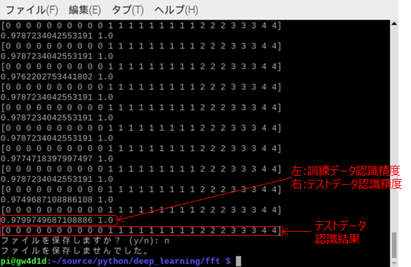 実行時は、fftのディレクトリに入り、以下のコマンドを実行してください。最後にファイルを保存するか聞いてくるので、学習したパラメータを保存する場合は’y’を、保存しない場合は’n’を入力して、プログラムを終了させてください。