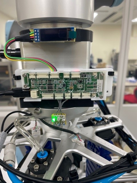 アームロボット先端に、ステータスLED(赤、緑、青)とOLED表示装置を装着した事例です。OLED表示装置はセンサモジュールの外部I2Cコネクタに接続しています。