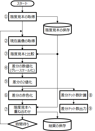 合わせて、2値化時に白のドット数を計算し⑧、出力します⑨。この白ドット数は、限度見本から変化したドット数であり、現在画像が限度見本から変化したかどうかを判定するための数字になります。