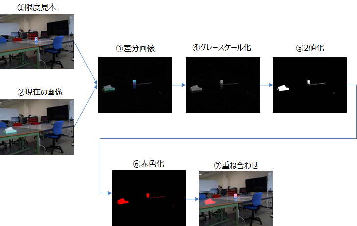 画像処理の手順(フロー)を以下に示します。差分画像③をグレースケール化④することで各ビットを一つの数値に変換します。その後、閾値で黒と白に2値化⑤します。そして重ねた時に分かりやすいように赤色に差分の色を変えて⑥、限度見本に重ね合わせます⑦。