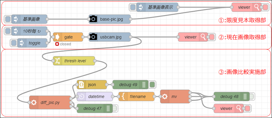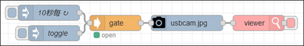 ② 現在画像取得部:定期的に画像を取得します。画像は、usbcam.jpgとして保存します。 gateノードはON/OFFのスイッチ機能です。