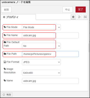 injectノードで定期的にusbccameraノードにアクセスして、画像を取得します。usbcameraノードで“File Mode”=File Modeに設定します。そして、取得した画像は、File Nameに指定したファイル名で、“File Default Path”=noを選ぶと表示されるFile Pathに保存します。