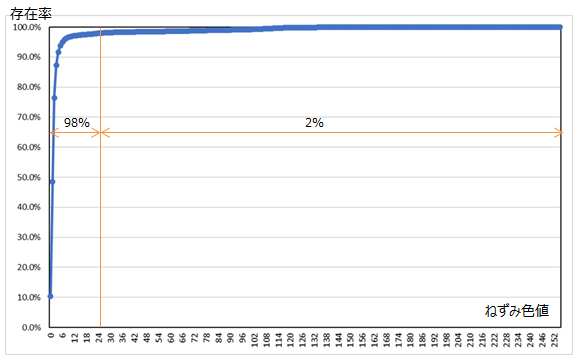 各ビットの数値の分布図は次のようになります。25までに98%のドットが含まれます。