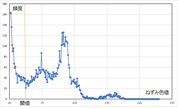 閾値を決めるために、横軸を26~255として残り2%の分布をみてみると次の図のようになり、50~150のねずみ色値の間にもう一山あります。これが、差分を表現しているねずみ色群とみなせます。