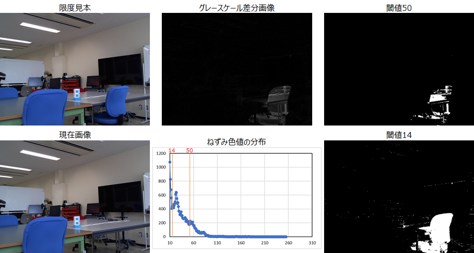 次のような限度見本と現在画像の比較をしてみます。椅子が1脚無くなっています。グレースケール差分画像はいろんなねずみ色を含んだ椅子型になっています。ねずみ色値の分布を調べると、23あたりにピークがあります。これを閾値50と閾値14で2値化した図を次に示します。閾値50の方は、椅子と分かりにくい差分画像になっています。閾値14の方は椅子の形と分かりますが、ノイズが目立ち始めます。暗い色の面積の広い差分がある場合は、閾値の値に要注意です。黒(0)から調べてピーク値を探し、その手前の谷の値を閾値にするとよいかもしれません。