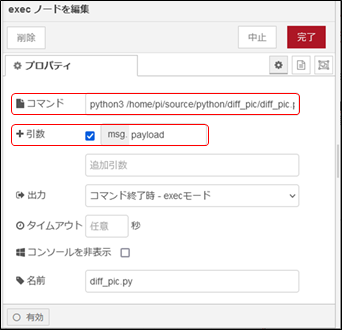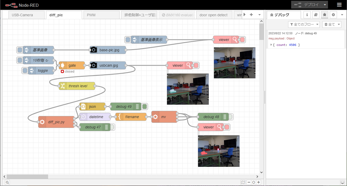 ③ 画像比較実施部:現在画像取得後、execノードでpythonプログラム”diff_pic.py”を起動します。pythonのプログラムファイル名は、フルパスで記載します。引数欄にチェックを入れ、引数として、閾値をmsg.payloadに載せて渡します。標準出力への変化ドット数は、今後の使用を考慮して、jsonとしてデバッグノードに表示します。差分と重ね合わせた結果ファイルは、日時情報を付けて、 “diff_20230822-140505.jpg”のフォーマットで逐次保存されます。