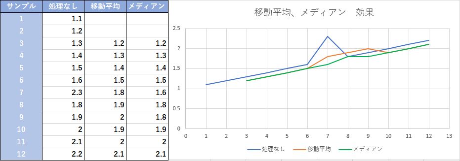 移動平均とメディアンフィルタの処理例