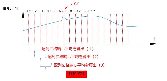 移動平均の処理ではサンプリングしたデータを配列に格納し、その中で平均を算出して出力とします。下記の例では3項目の移動平均フィルタの処理を示していますので、最初の3回のサンプリングで得られたデータを配列に格納し平均を算出(1)を行います。次のサンプリングデータが取得出来たら、先ほどの配列の最も古いデータを破棄し、新たに得られたサンプリングデータを配列に加えて平均を算出(2)します。同様に、次のサンプリングデータが得られたらもっとも古いデータを破棄し、新たなデータを配列に加えて平均を算出(3)という具合に処理を進めて行きます。