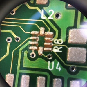 顕微鏡で確認すると、小さなパッド上に上手くクリームはんだの層ができているのが分かります(上図19)。