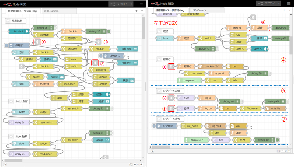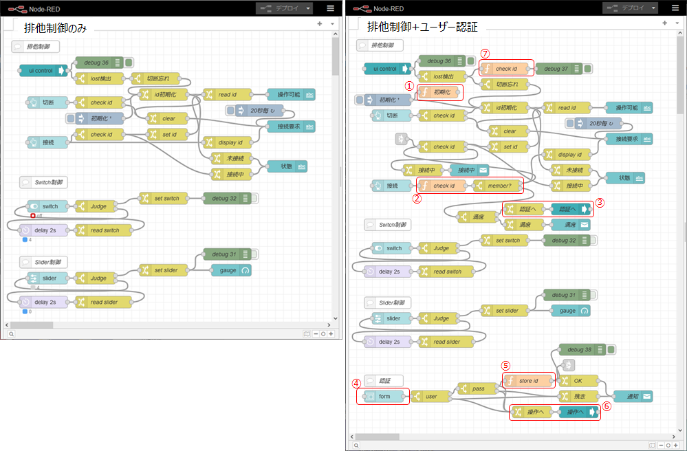 次にNode-REDのフローを説明します。下の図の左側は上記で説明した排他的操作のみのフローです。右側はそれに、ユーザー認証を追加したフローです。