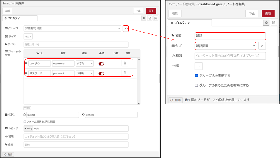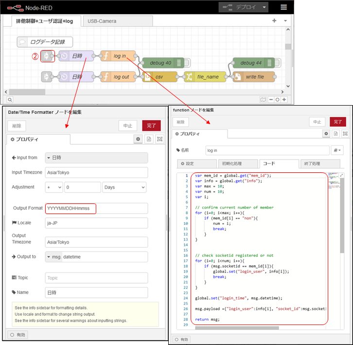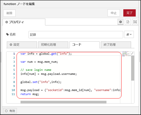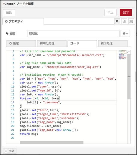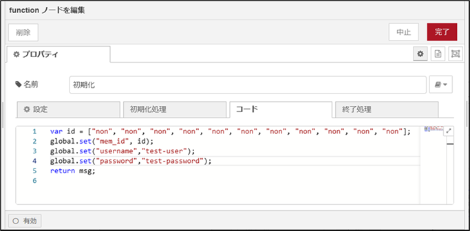 ①のfunctionノードは、Node-RED起動時に、mem_id[]の初期化とusernameとpasswordの設定を行っています。