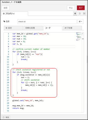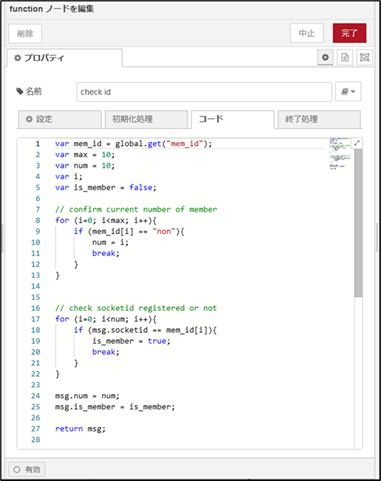 排他制御のcheck idのノードへ移動し、存在しなければ、登録者の人数が10名に達しているかどうかのチェックを経て、③の認証画面への移行へ移ります。②のfunctionノードでは、上のsocktid記録簿の実装の「c) mem_id[]にsocketidが登録されているかの確認」で述べた内容を実装しています。